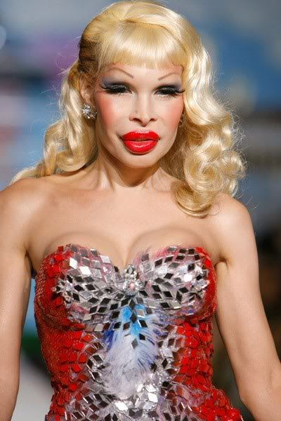 Jenna Jameson and Amanda Lepore ho it up at the Heatherette fashion show. First of all, how come a tranny looks more like a woman than Jenna Jameson? Ugh, that's so nasty. I mean Jenna, loook at her legs!!